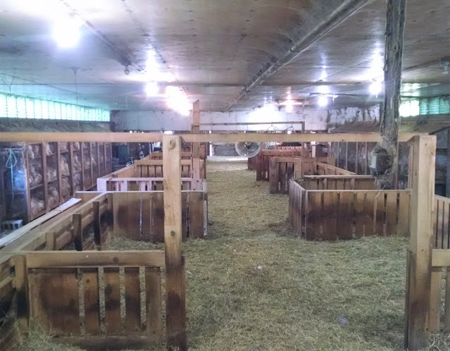 We don't normally need to keep the sheep cool AND in the barn but this year with a week of mid-80s predicted we knew we'd have to take some kind of measure to keep them comfortable. When we used to have a building full of ram lambs in the summer we had a large box fan going for them but it hadn't been needed for a few years. Time to press it into service. First Andy had to create a 2X6 the right dimensions to support it. The buzz rig was pressed into service as a big table saw.